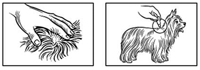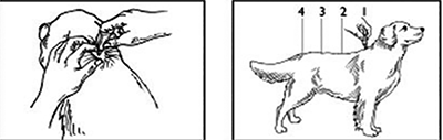 b. En perros grandes separar el pelo en cuatro diferentes puntos a lo largo del dorso del animal hasta ver la piel y aplicar el contenido.