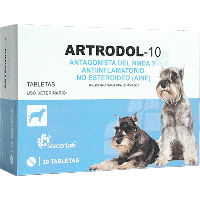 ARTRODOL-10: 1 tableta por 10 kg de peso cada 24 horas durante 7 días. (Amantadina 3 mg por cada kg de peso, Meloxicam 0.1 mg por cada kg de peso).
