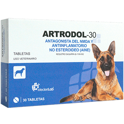 ARTRODOL-30: 1 tableta por 30 kg de peso cada 24 horas durante 7 días. (Amantadina 3 mg por cada kg de peso, Meloxicam 0.1 mg por cada kg de peso).