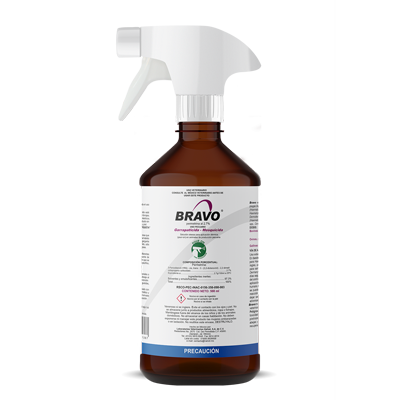 BRAVO es una solución oleosa ectoparasiticida a base de permetrina y sustancias sinergizantes que actúa contra moscas, mosquitos, pulgas, piojos, garrapatas, ácaros de la sarna y corucos.
