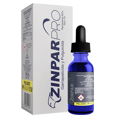 DESCRIPCIÓN: ZINPAR PRO es una solución ectoparasiticida a base de permetrina y sustancias sinergizantes que actúa contra insectos (pulgas y piojos) y ácaros (garrapatas y ácaros de la sarna). La permetrina es un piretroide sintético tipo I, efectivo insecticida neurotóxico que actúa por contacto directo en el parásito provocándole la muerte.