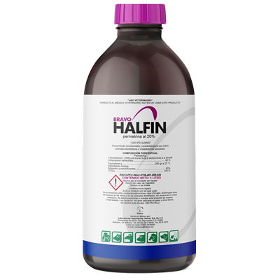 BRAVO HALFIN es un líquido concentrado emulsionable para uso por aspersión a base de permetrina y sustancias sinergizantes que actúa contra ectoparásitos. La Permetrina es un piretroide sintético tipo I, que actúa por contacto directo en el parásito provocando la muerte.